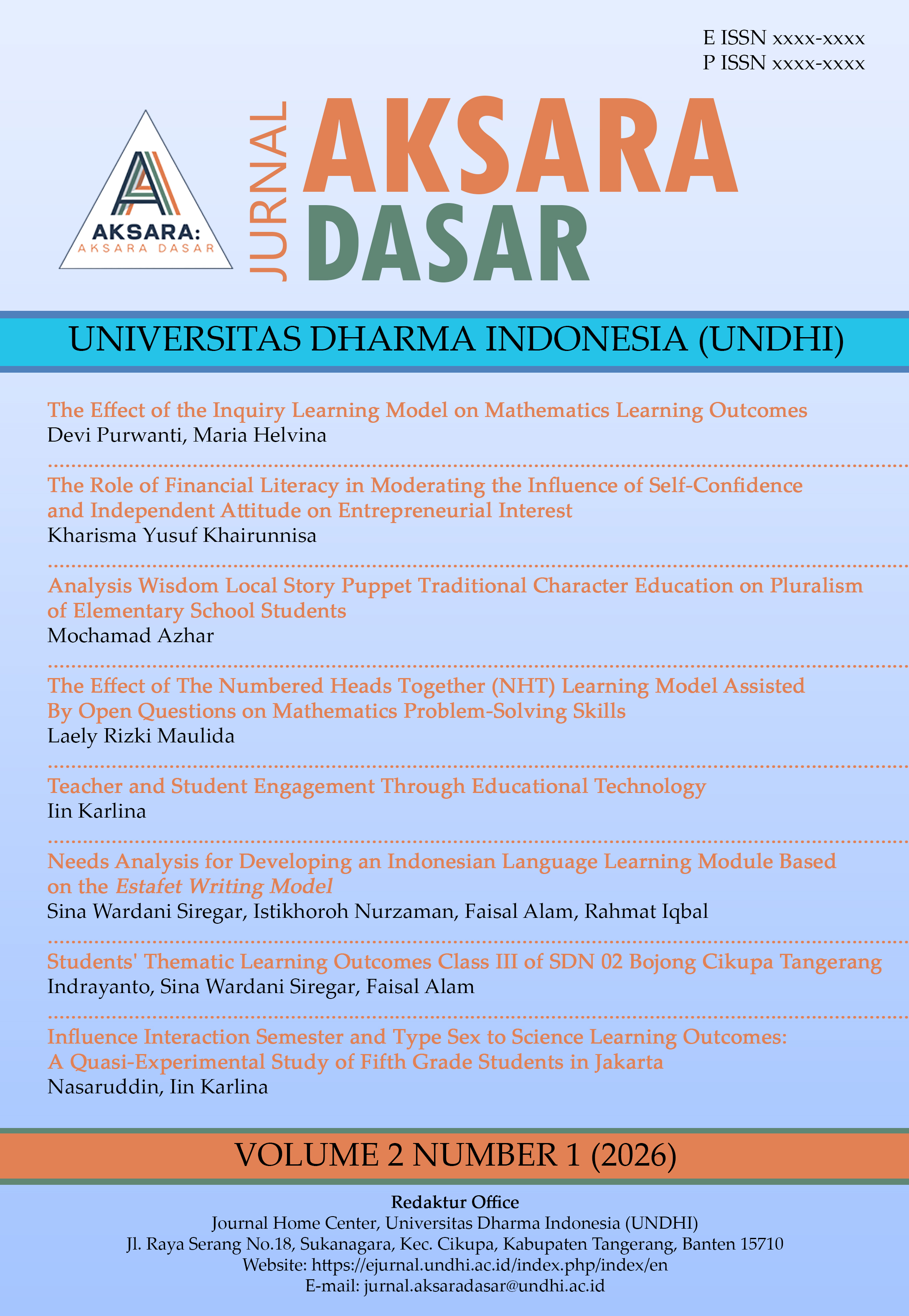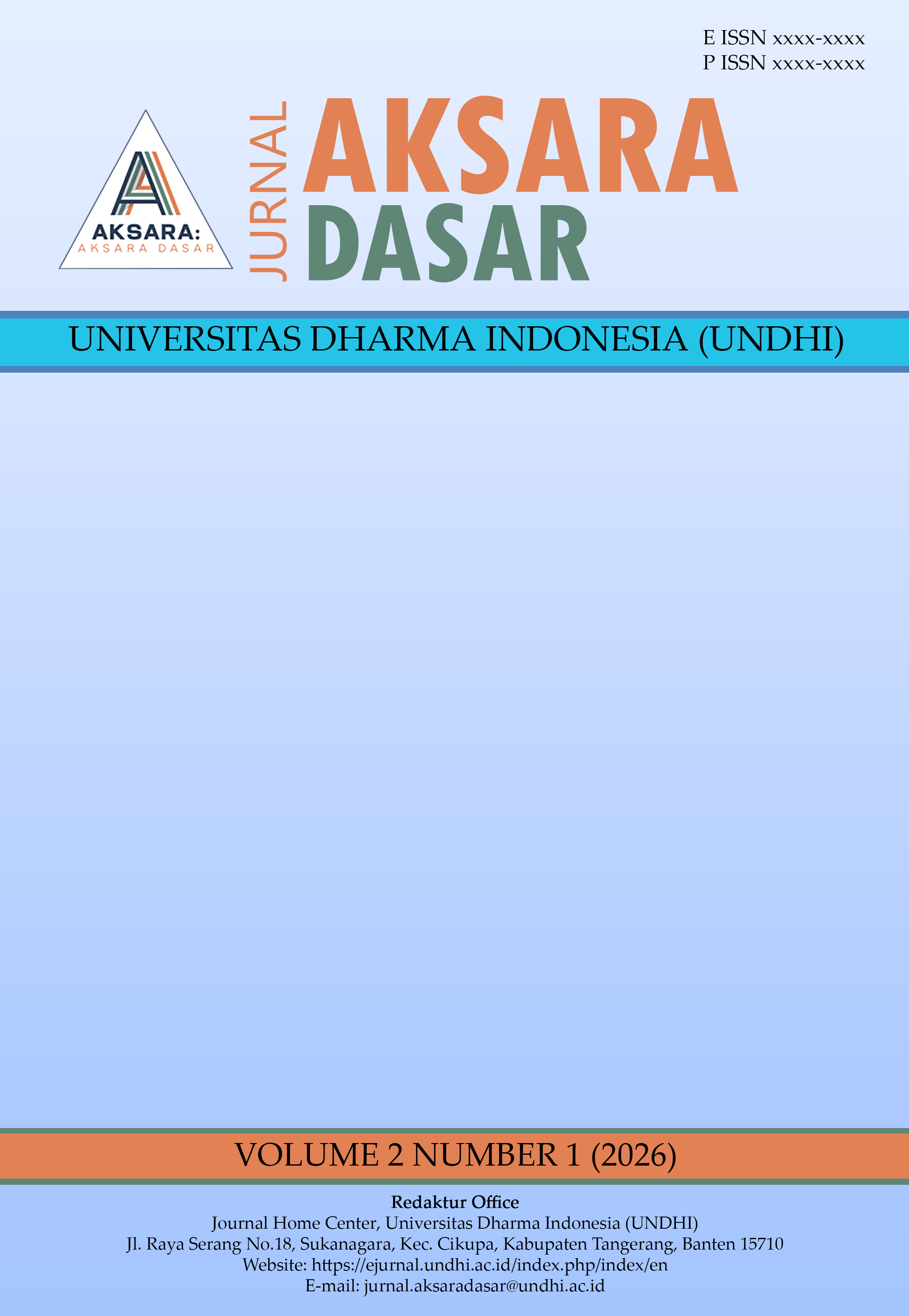 Published by the Faculty of Teacher Training and Education, Universitas Dharma Indonesia (UNDHI), Aksara Dasar Journal focuses on research and studies in the field of Elementary School Teacher Education. The journal is published biannually, in January and July, and provides a platform for scholarly contributions on theory, practice, and innovation in elementary education.