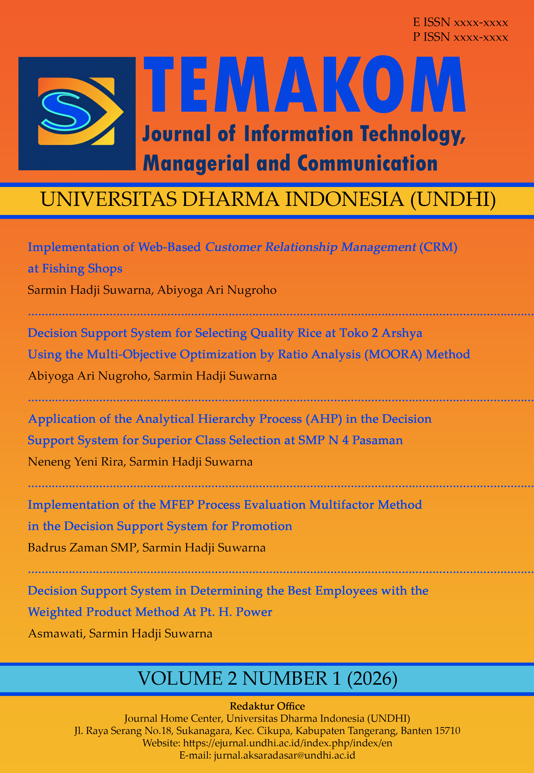 Published by the Faculty of Computer Science, Universitas Dharma Indonesia (UNDHI), the Journal Teknologi Informasi, Manajerial dan Komunikasi focuses on research and studies in the fields of Information Technology, Management, and Communication. The journal is published biannually, in January and July, and serves as a platform for scholarly contributions addressing theory, practice, and innovation in information systems, managerial studies, and communication sciences.